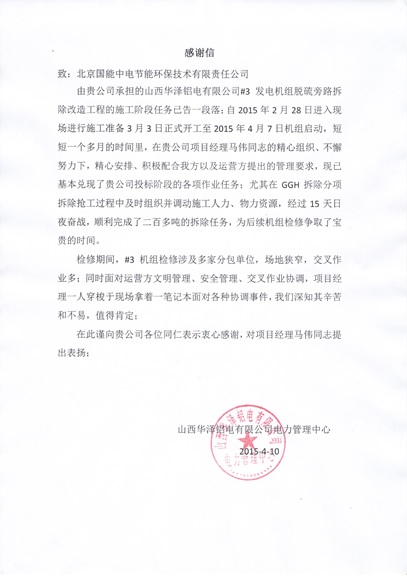 當前位置: 國能中電公司動態> 山西華澤鋁電旁路改造EPC項目受業主表揚